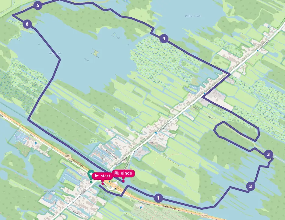 Deze goed bewegwijzerde route, gemarkeerd met blauwe pijlen en gele borden met zwarte nummers, is 7 kilometer lang en duurt ongeveer 2,5 tot 3 uur. Geschikt voor zowel beginnende als ervaren supper, voert de tocht je door open plassen, smalle slootjes en langs legakkers, met steeds wisselende vergezichten die je het gevoel geven in een levend schilderij te glijden.